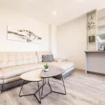 The apartment offers a living room and a fully equipped kitchen, as well as comforts like an air conditioner and a washing machine.